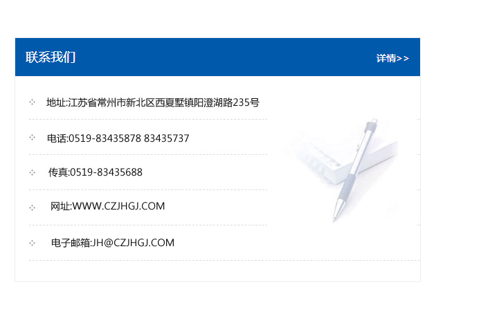 傳真:0519-83435688    郵編:213135    網址:WWW.czjhgj_com.px-ebp.com    電子郵箱:JH@czjhgj_com.px-ebp.com